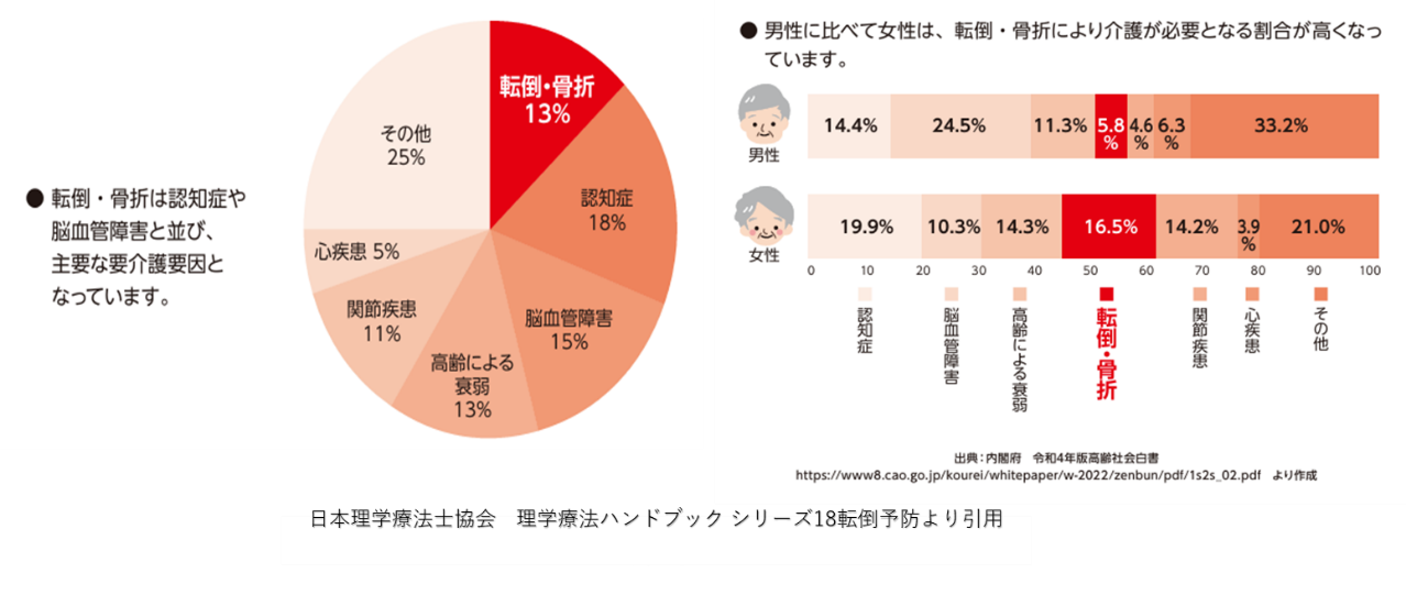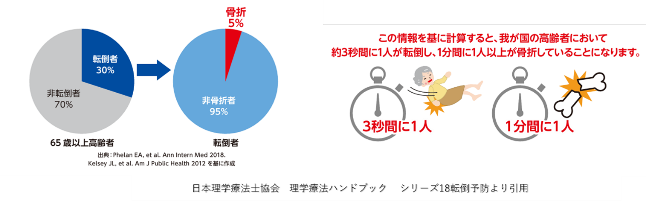 65歳以上の高齢者における転倒率は30%となっており、約3人に1人が、1年の間に1回以上転倒するというデータが出ております。また、転倒された人のうち5%に骨折が認められたと言われており、これを我が国の高齢者人口(令和6年3624万人)を基に計算すると約3秒に1人が転倒し、1分に1人以上が骨折していることになります。この数字から転倒というものが非常に身近に起きていることがよくわかるかと思います。