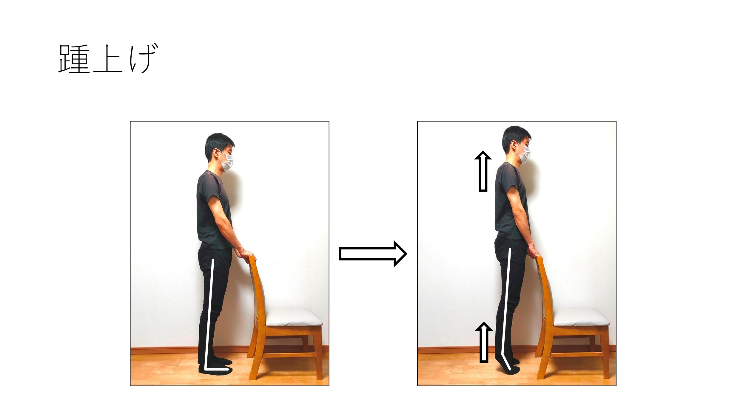 まずは踵上げです。体を真上に持ち上げるように伸ばしていきます。このときに、体が前に傾いて、手にもたれかからないように注意してください。