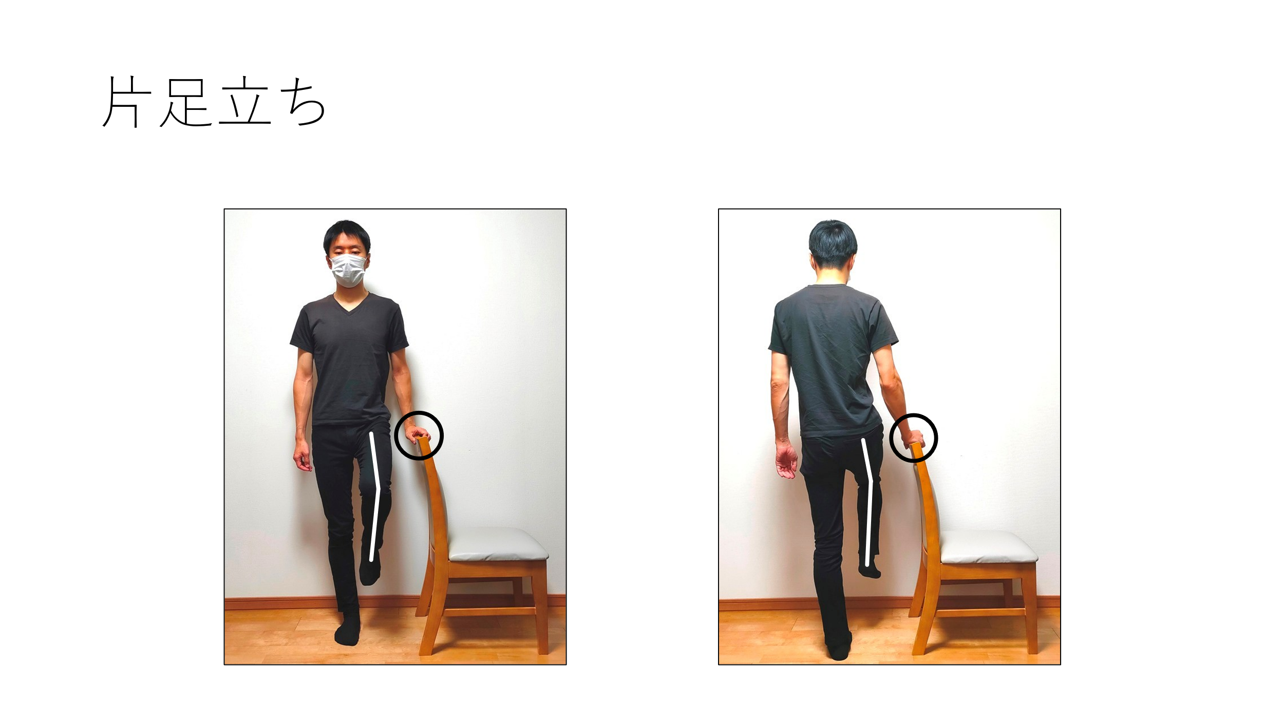 最後に片足立ちですが、手で支えてる方と同じ側の足を上げて、20秒保って下さい。できる限り画像のように体が傾かないように真っすぐ実施して下さい。