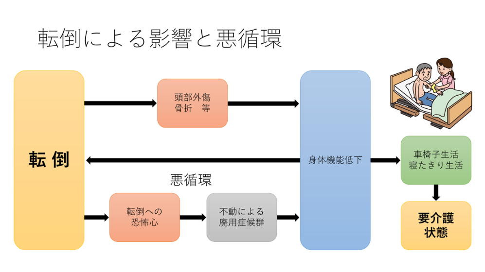 若い時であれば転倒し軽いけがですむこともありますが、高齢者の場合は骨折や頭部外傷など大事故になる可能性があり、回復までに時間がかかることから、その間に身体機能が低下してさらに転倒リスクが高くなってしまいます。また、けがをせずに済んだとしても、転倒したことから恐怖心が生まれ、体を動かす機会が減少し、身体機能が低下していく悪循環に陥り、最終的に車いす生活や寝たきり生活といった要介護状態となってしまう可能性もあります。このことからも転倒を予防すること、悪循環を断ち切ることが大切であることが再認識できるかと思います。