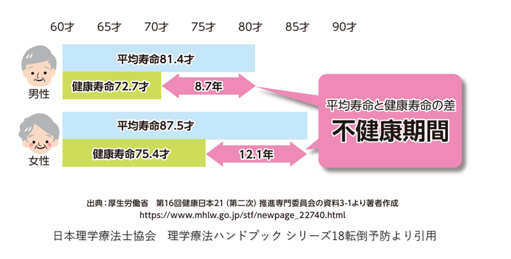 先ほども述べた通り転倒は、要介護状態をまねく主要な要因の1つで、不健康期間を作り出してしまい健康寿命を短くするといった悪因となっていることがよくわかるかと思います。