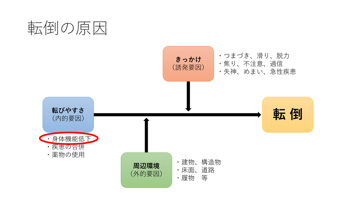 転倒の原因には、大きく分けて3つ要因が絡んでおります。一つ目は個人が転びやすい状態である内的要因、二つ目は転倒へ繋がるような周辺環境である外的要因、そして、三つ目は普段の状態であれば転倒しない場合でも、焦りがあったなど何かしらの影響が加わることで転倒に繋がるきっかけとなる誘発要因があります。本来であれば全てをご説明したいところですが、今回はこの中の、内的要因に絞って説明をします。