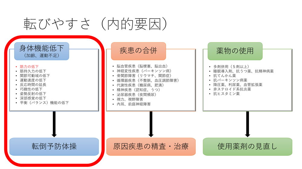 内的要因には、加齢や運動不足からくる身体機能の低下に加え、疾患の合併や薬物使用があり、それぞれに対策が異なります。今回は、この身体機能低下の中でも転倒リスクを最も高めてしまうとされる筋力低下についての転倒予防体操をご紹介します。
