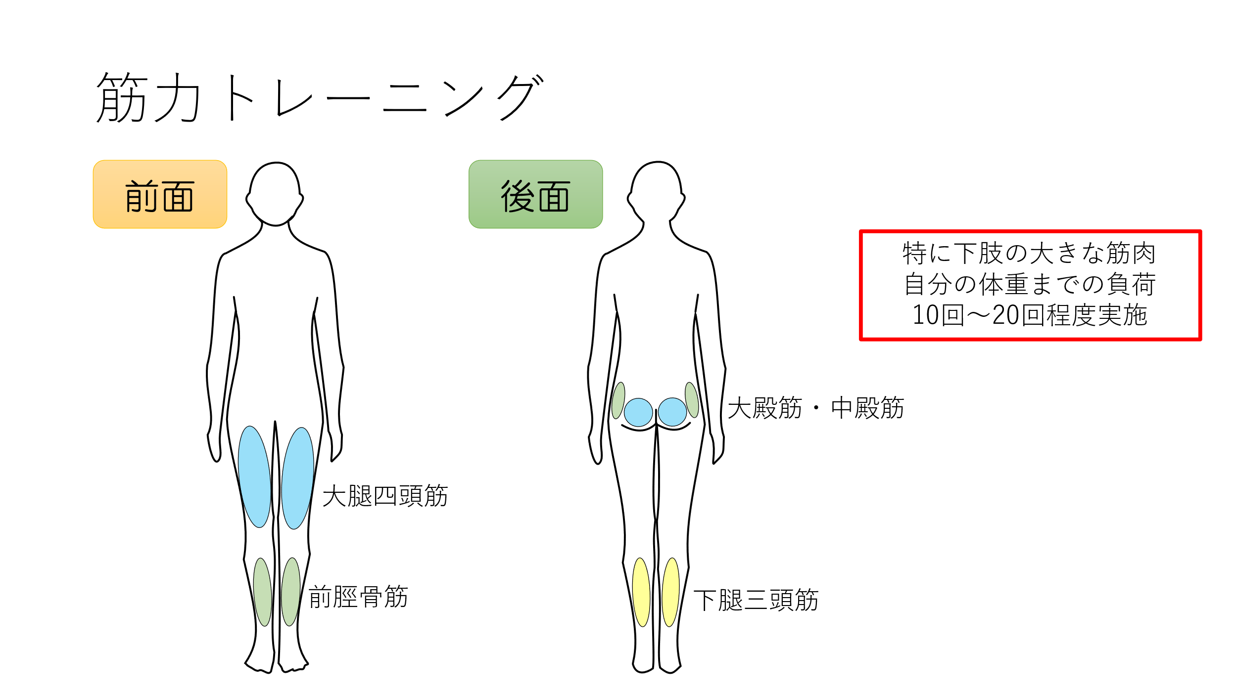 筋力低下を防ぐためには筋力トレーニングを行いますが、転倒予防には特に下肢の大きな筋肉が重要で、負荷量としては自分の体重程度までの負荷、回数は部位に合わせて10回〜20回程度で行います。主にはモモの筋肉、向う脛やふくらはぎの筋肉、お尻周囲の筋肉が大切となります。